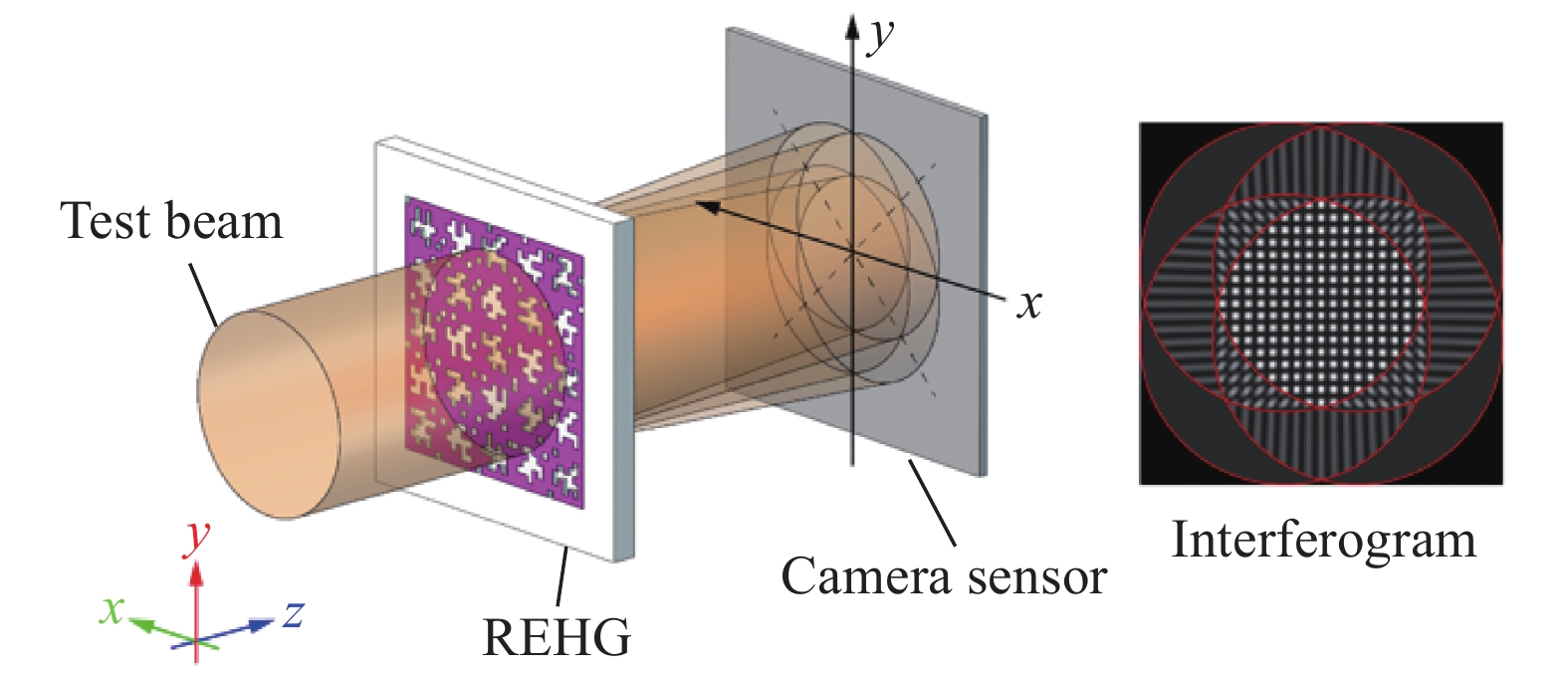 図1ランダムにコード化されたハイブリッドグレーティング(REHG)を使用した4波横方向せん断干渉に基づくフェーズイメージングの原理